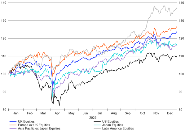 More broadly, shifts in relative interest rate expectations and currency trends have favoured non-US assets during 2025. Emerging market equities, having already gained 26.7% in 2025 – their strongest performance since 2017 – continued to attract inflows.