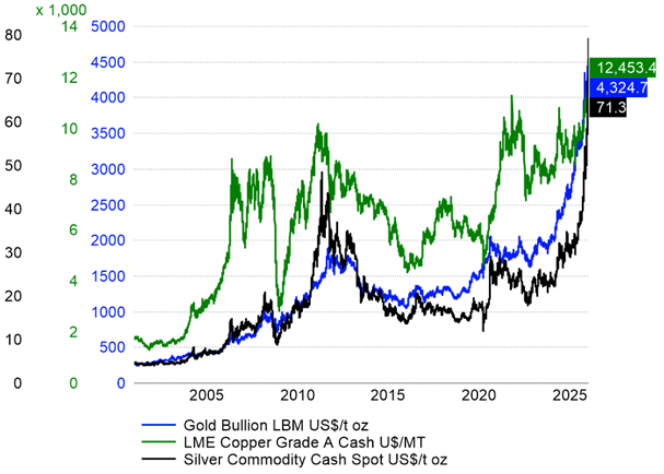 Commodity rally reached extremes: Gold surged to record highs above US$4,500 per ounce and silver approached US$72, reflecting safe-haven demand, currency weakness and expectations of further monetary easing across developed markets.