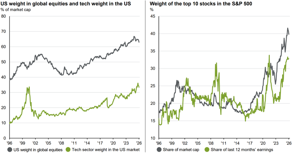 Source: JP Morgan Guide to the Markets – UK, Data as of 30 January 2026. (Left) LSEG Datastream, MSCI, S&P Global, J.P. Morgan Asset Management. The S&P 500 is used to represent the US market, and the MSCI All Country World Index is used to represent global equities. (Right) FactSet, S&P Global, J.P. Morgan Asset Management. The top 10 stocks are based on the 10 largest index constituents at the start of each month. Past performance is not a reliable indicator of current and future results.