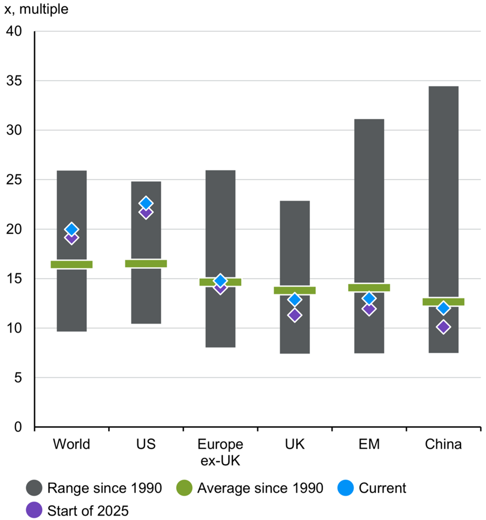 This was exemplified by Nvidia becoming the first publicly traded company to achieve a $4 trillion valuation. As a result, market breadth has once again narrowed with the performance of larger cap companies making new highs relative to the wider market and in the process has taken the valuation of large cap US stocks towards the upper end of their historic ranges.