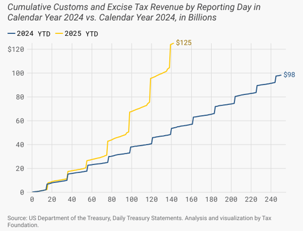 A small offset to US fiscal spending is the US’s tariff policy which has been used for both fiscal and political ends and, in the process, has created uncertainty in global trade relations.