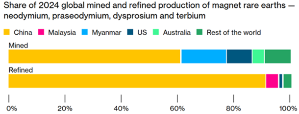 A softening of US-China trade relations provided one of June’s more encouraging developments following months of escalating tensions. High-level trade discussions between US Treasury Secretary Scott Bessent and Chinese Vice-Premier He Lifeng resulted in a breakthrough on the contentious issue of rare earth elements, a key point of leverage for China. China’s agreement to resume rare earth exports through six-month licences provided temporary relief to supply chain concerns threatening automotive, robotics and defence sectors. This couldn’t come soon enough for companies such as the Ford Motor Co. which was reportedly forced to idle US based factories for three weeks due to a shortage of magnets that contain rare earth minerals. China’s agreement to resume limited exports offered a short-term reprieve but underscores longer-term challenges and uncertainty in global supply chains.